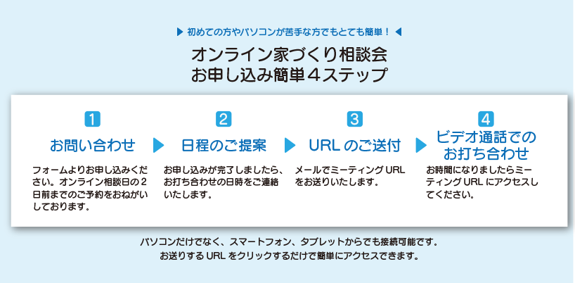 初めてでも簡単。遠くからのご相談・仕事で夜しか時間がない方でも大丈夫。設計相談、土地探し相談、その他様々な家づくりの素朴な疑問にもお応えいたします!