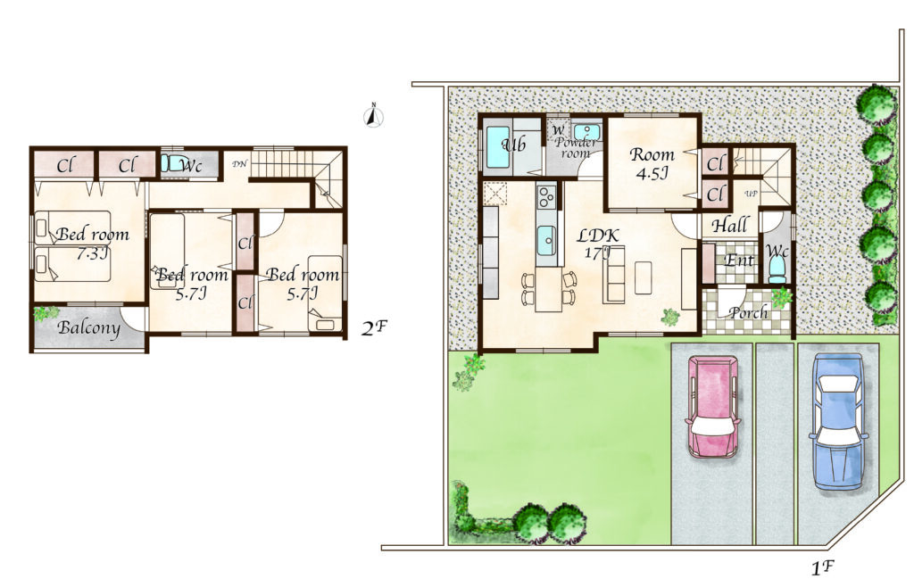 2通りの異なる雰囲気・デザインから、お好みに合わせた間取りや内装をお選びいただけます。自由設計だからこそ実現できる、自分たちだけのオーダーメイドハウスです。