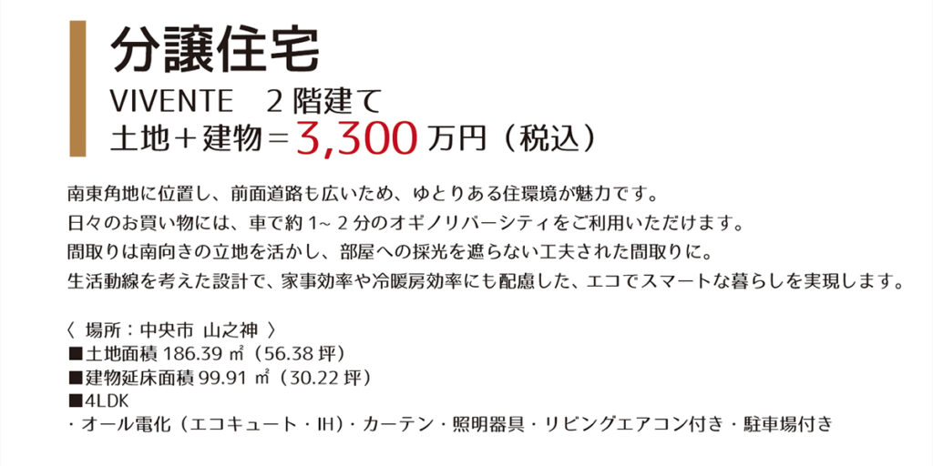 ■所在地:山梨県中央市山之神(2025年12月完成)■交通:JR身延線「常永」駅下車2500m■地目:宅地■都市計画法に基づく制限:市街化区域第一種中高層住居専用地域■建ぺい率:50%■容積率:80%■開発許可番号:山梨県指令都第4-48 号(昭和51年1 月30 日付)■道路:中央市道、幹線及び準幹線舗道付4 ~ 16m、アスファルト舗装■建築許可番号:日住評確第25190149 号■手付金等の保証機関:三井住友信託銀行■取引:売主